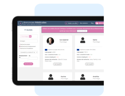 Accédez à notre vivier de + 100 000 candidats pour découvrir leurs profils puis, à l'aide de nos filtres, choisissez et contactez directement les professionnels de santé qui vous intéressent par mail ou par téléphone.